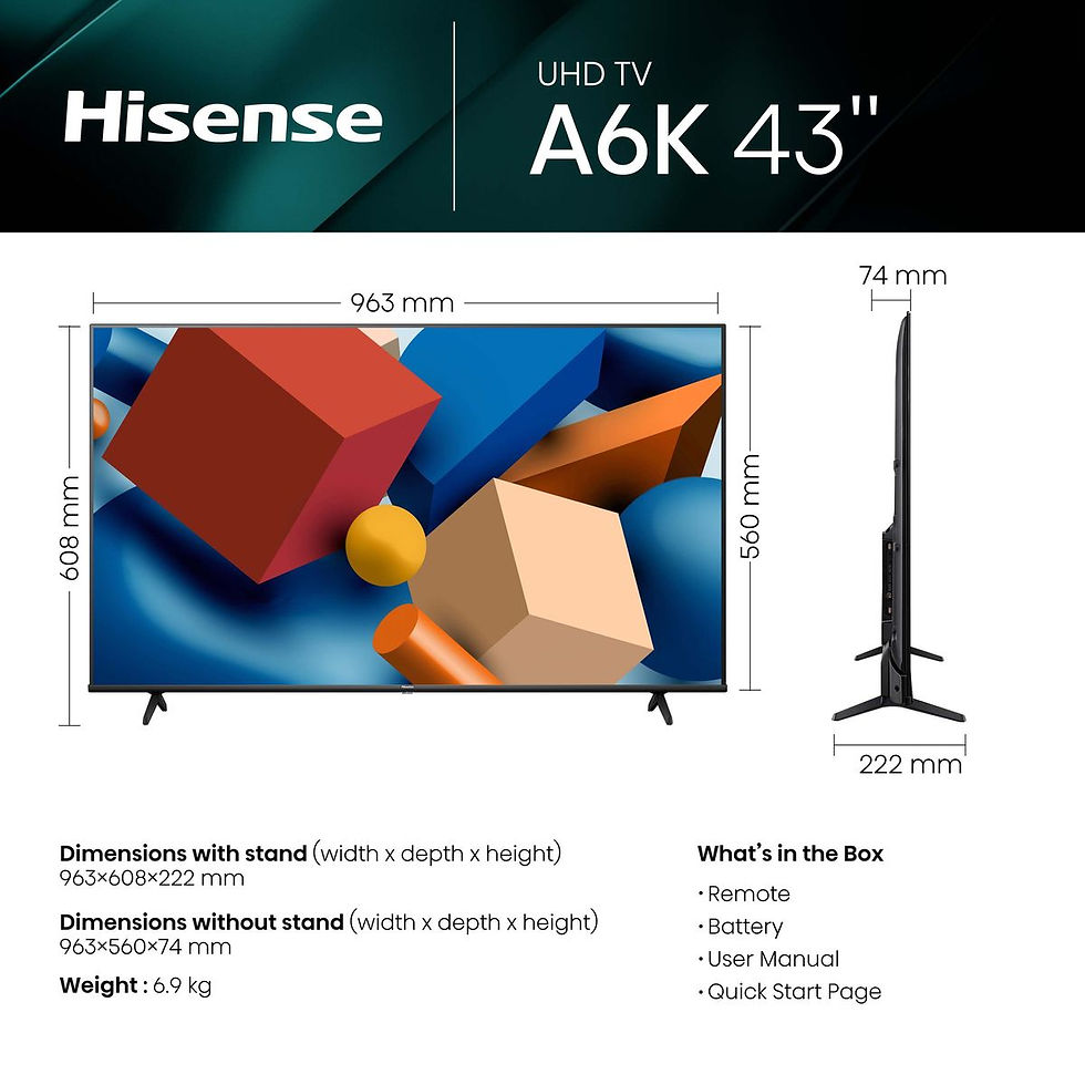 Experience cinematic brilliance at home with the Hisense 65A6N 65" 4K Ultra HD Smart TV. Designed for immersive entertainment, this LED TV delivers razor-sharp visuals, vibrant colours, and ultra-smooth motion-whether you're streaming, gaming, or watching live sports. The powerful 4K upscaling ensures even lower-resolution content looks stunning, while Dolby Vision and HDR10+ enhance contrast and detail for a truly lifelike picture.